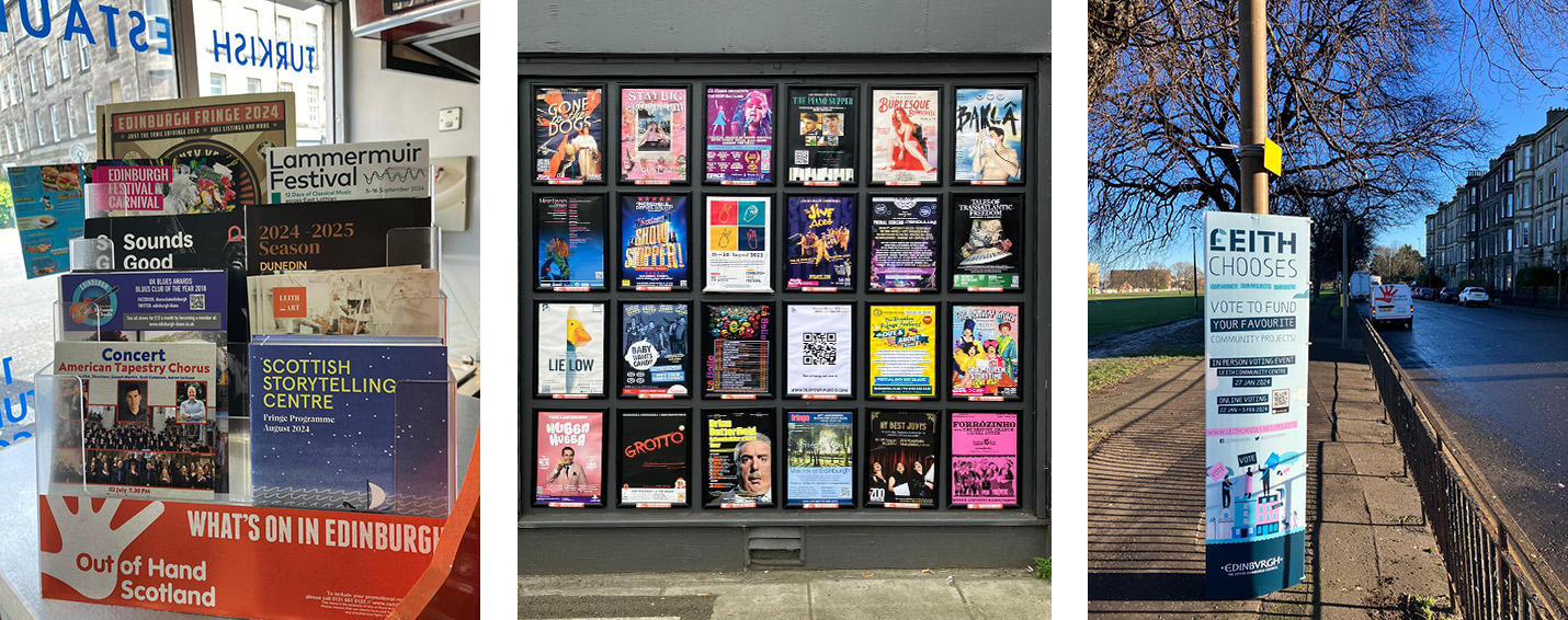 The largest arts festival in the world – working in partnership with The City of Edinburgh Council, we offer outdoor advertising spaces to all performers and venues. We also print hundreds of thousands of flyers / The largest arts festival in the world – working in partnership with The City of Edinburgh Council, we offer outdoor advertising spaces to all performers and venues. We also print hundreds of thousands of flyers / leaflets and posters for Fringe shows. We offer flyer and poster distribution to indoor outlets and on the street with our promotional teams undertaking hand to hand activity in all the hot spots throughout the city centre.